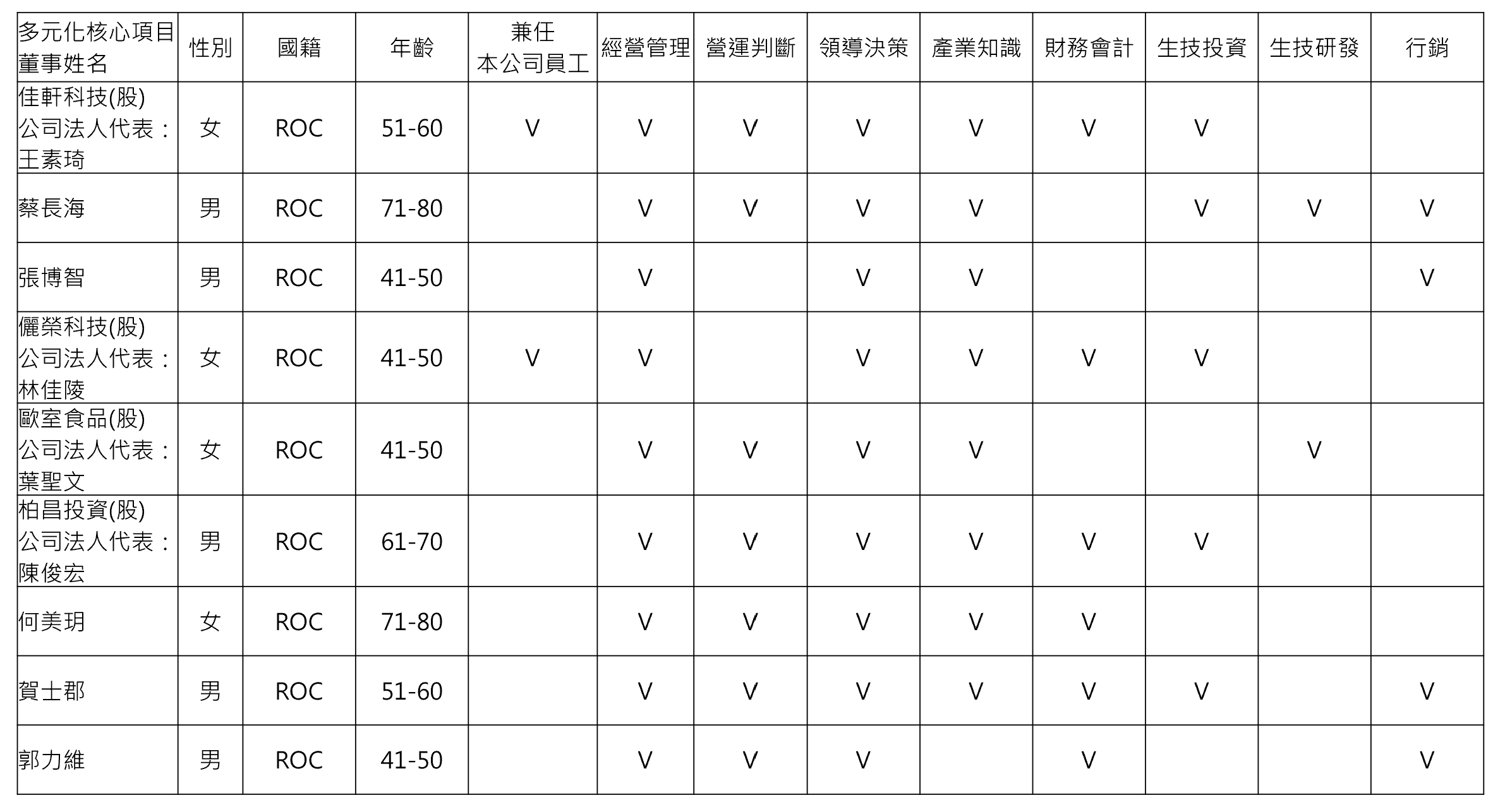 (一)本公司多元化目標以女性董事席次至少占1/3(含),及獨立董事1/2以上其連續任期不超過三屆為目標。本公司於114年股東會改選後,目前女性董事共計4席,占全體董事席次4/9;獨立董事3席中有2席連續任期不超過三屆,符合本公司多元化目標。此外,董事多數具有擔任多家上市櫃公司董事或獨立董事之經驗。董事成員背景涵蓋產業與管理經驗及財會、生技投資、生技研發、行銷等專業領域,具備產業、學術、專業等多樣化之背景,可從不同角度給予專業意見,對提升公司經營績效及管理效率有相當之助益。